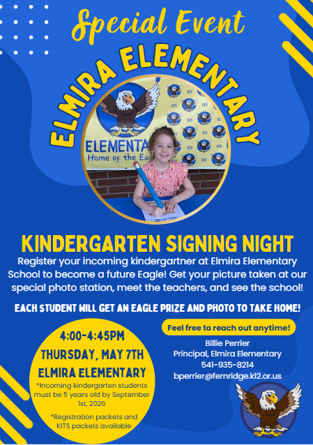 Elmira Elementary School (EES) is located within the Fern Ridge School District. We enroll students in Kindergarten through 5th grades. We are one of two elementary school in FRSD, and are the home of the Eagles! Explore our website to learn more about us, and reach out with any questions!